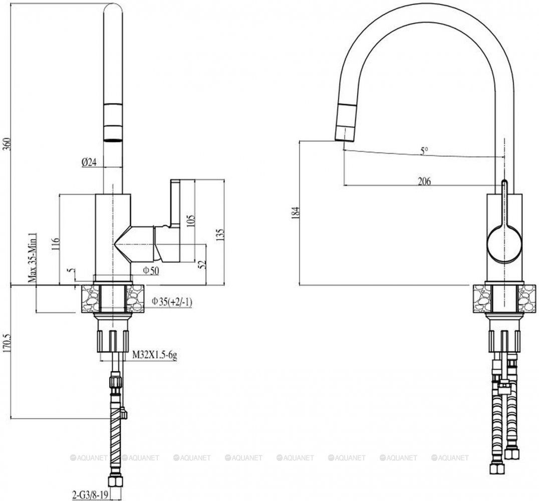 гибкие шланги длиной 450 мм, стабилизирующая пластина для увеличения устойчивости смесителя